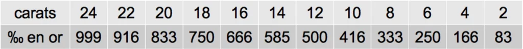 Voici la correspondance des titrages en carats :
