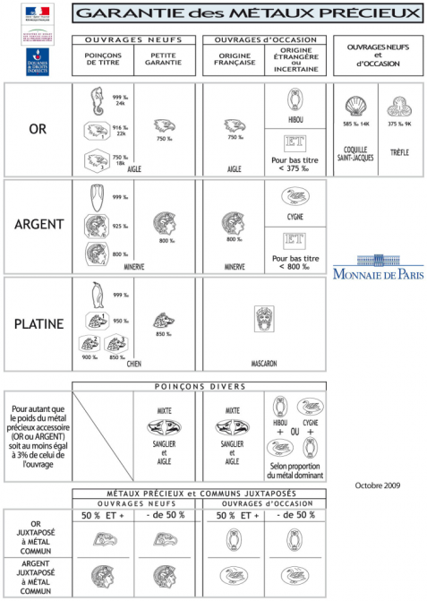 Voici le tableau officiel des poinçons de garantie en France pour chaque métal précieux :