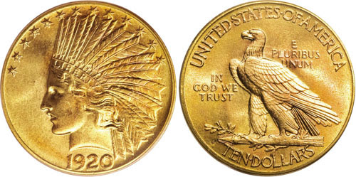 Augustus Saint-Gaudens grave la pièce de 10 dollars indien, surnommée désormais "Indian Head", et la frappe de 1907 à 1933. On l’appelle également l’Eagle indien, puisque sa valeur faciale est de 10 dollars.